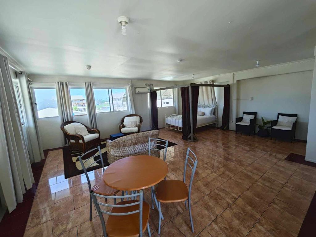 "Location excellent right across from Harbour as we went on boat daily Whale swims! Staff were the highlight just so lovely and put to please…… The restaurant was the best in town too! We were able to gather on balcony each afternoon as we were a group of 8 a beautiful garden outlook. Lots of noise, but that’s Tonga, church bells ringing early in the morning and dogs barking so Ear Plugs a must!!"